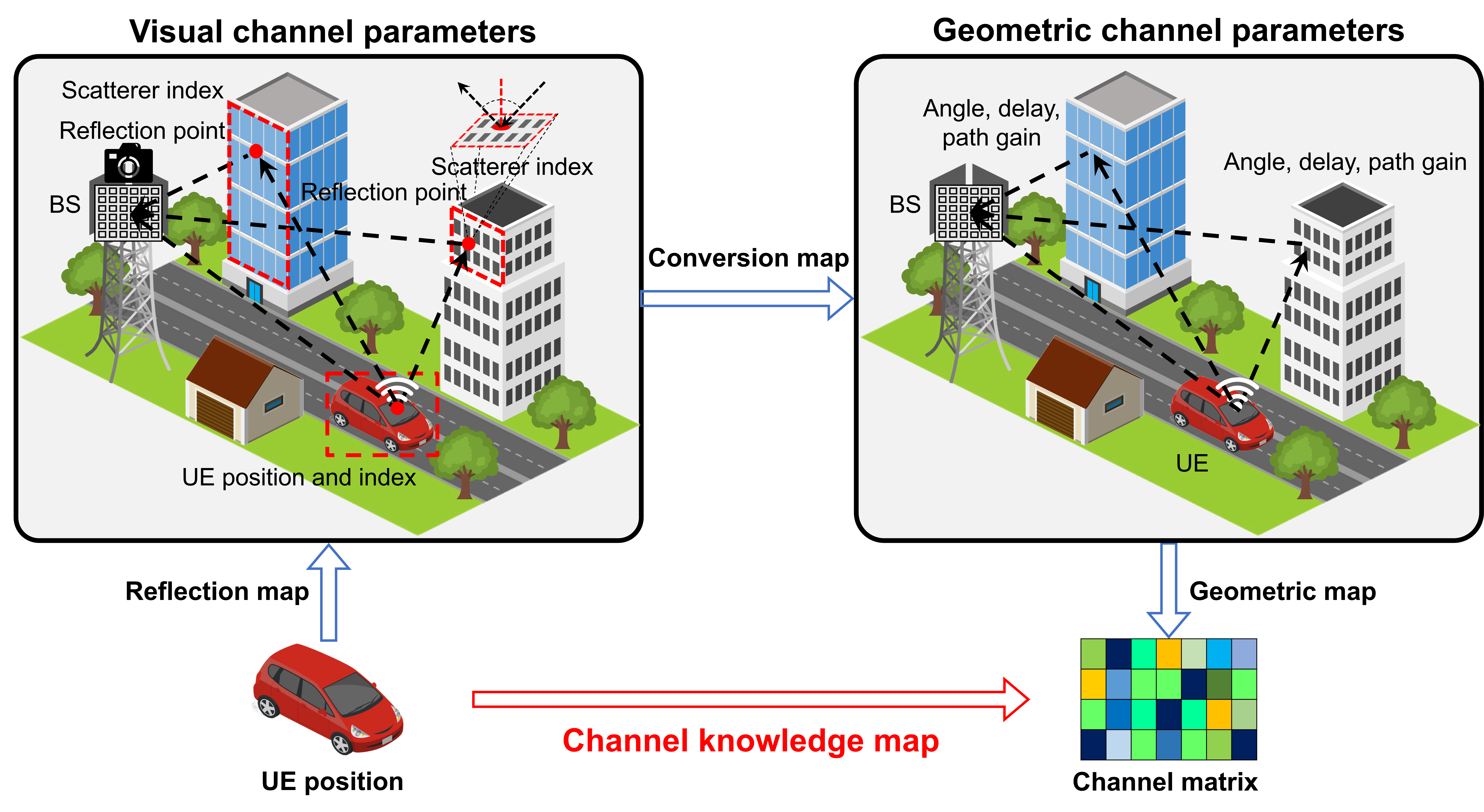 The new approach proposed by WINS Lab at MIT reframes CKMs around visual channel parameters (VCPs). Instead of describing the channel only by angles and delays, the VCP-based approach works with reflection points and scatterer indices that depict the scene geometry directly. The proposed CKMs are a composition of three submaps: a reflection map from position to VCPs, a conversion map from VCPs to GCPs, and a geometric map from GCPs to the channel. VCPs inject contextual knowledge about objects and boundaries, which is the missing piece for handling sudden blockages and multipath changes.